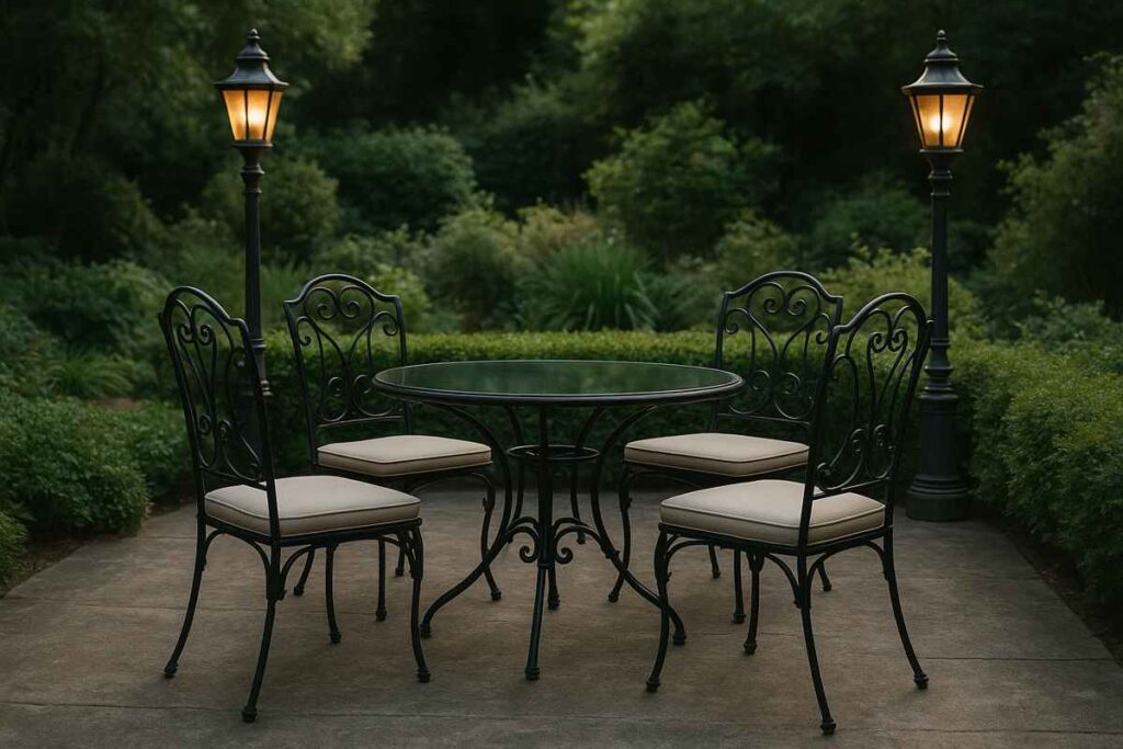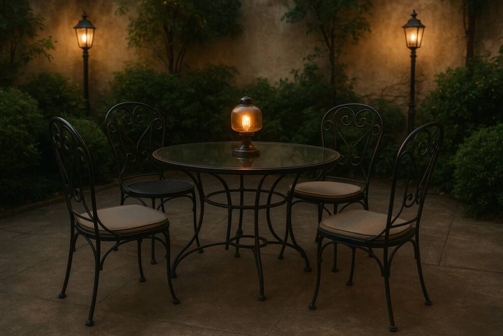 Os móveis metálicos transmitem força e sofisticação. São ótimos para áreas externas onde durabilidade é prioridade, especialmente quando o material passa por tratamento anticorrosivo.