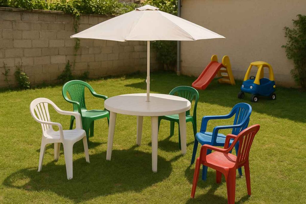Em áreas de lazer temporárias ou varandas que mudam constantemente de layout, móveis plásticos atendem bem.